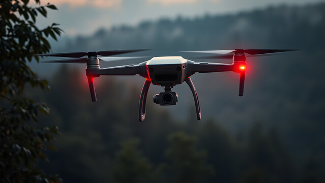 Drone flying over a forested landscape with its red navigation lights glowing, demonstrating advanced UAV technology in action. Ideal for surveillance, forest monitoring, and aerial photography applic