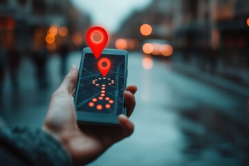Hand holding smartphone displaying a digital map with glowing red navigation pins on a blurred rainy city street background at dusk