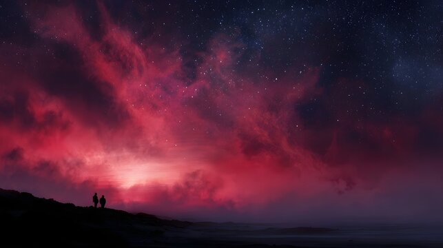 Silhouetted figures stand on a dark landscape watching a vibrant red nebula in the starry twilight sky