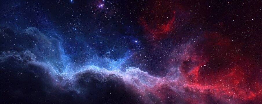 Vivid red nebula glows amidst a field of stars; celestial gas and dust swirl in a cosmic display