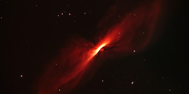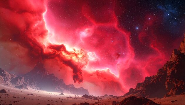 Close-up of a red nebula with a starry night sky in the background. the nebula appears to be a deep red color and is filled with small white stars.