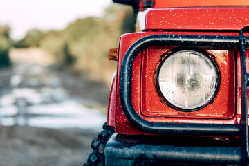 Closeup of headlight of red SUV vehicle parked on wet dirt path among green trees in countryside