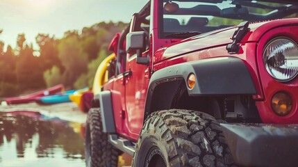 Part of an off-road vehicle on a dirt road with warm light. Adventure concept.Tire off-road on mud