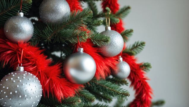Christmas decor with metallic silver orbs hanging from a soft red furry string, isolated on a white backdrop