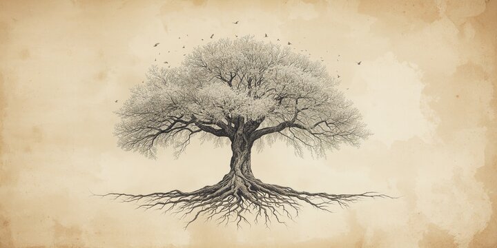 Vintage engraving of plant root networks showing importance of water, oxygen, and nutrients for tree sustainability