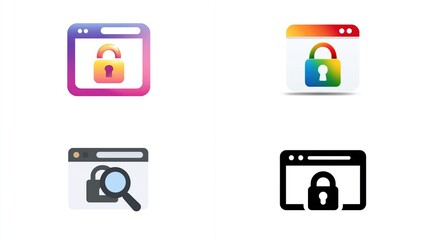 Four web browser icons, each with a padlock, showcasing varying color palettes and visual elements.  One features a magnifying glass