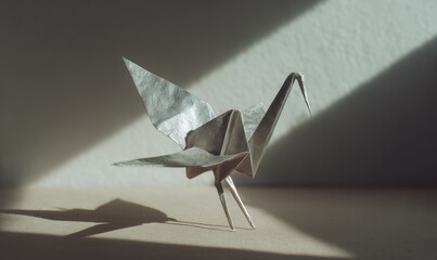 A solitary paper crane with a cherry blossom design on a backdrop of lush greenery, with room for additional elements in the picture (copy space image).