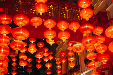Vibrant red chinese lanterns illuminating evening sky