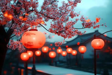 Chinese new year lanterns and cherry blossoms on red background