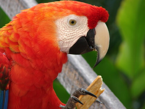 Two red parrots in flight. Macaw flying, green vegetation in background. Red and green Macaw in tropical forest, Brazil, Wildlife scene from tropical nature. Pair of beautiful birds in the forest.