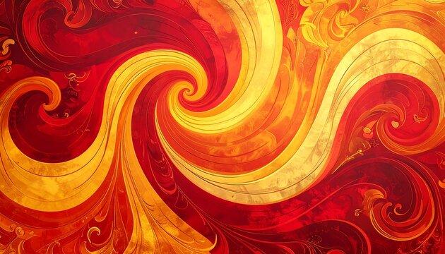 An abstract composition features swirling, golden and fiery red patterns, creating a dynamic and decorative backdrop. The warm color palette evokes energy and artistic expression