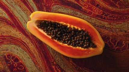 Halved papaya on vibrant textile with swirling red patterns.