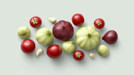 Red tomatoes, white garlic cloves, purple onions, and pale green pattypan squash arranged on a flat white surface with soft shadows and even lighting.