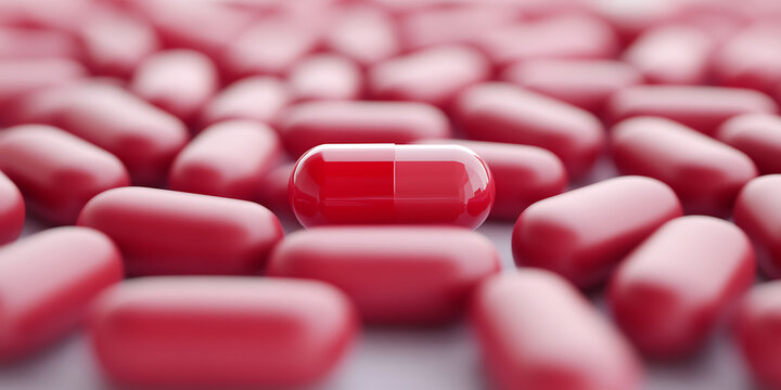 A close-up view of red capsules with a single standout, signifying focus, healthcare, or medicine. Red pills spread across the area, soft lighting, medical theme.