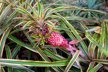 Pineapple on tree. Fresh tropical Red pineapple on tree in farm at Thailand. Top view.