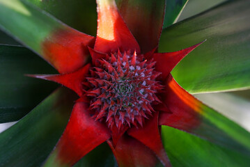 Red Pineapple flower with green leaves