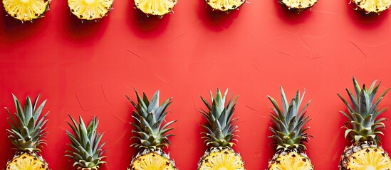 A summer themed copy space image featuring a pattern of ripe whole pineapples shot from above on a pale red background