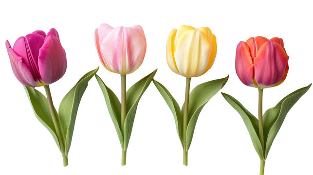 Flowers. Row of beautiful colorful tulips isolated on white background