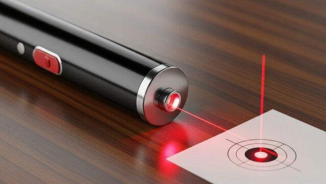 Modern black laser pointer emitting vibrant red light onto a bullseye target on a rich wooden