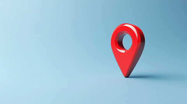 This image features a glossy red location pin set against a serene light blue backdrop. The pin signifies navigation, direction, or a specific point of interest on a map.