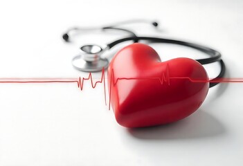 A red heart with a red pulse line in front of a stethoscope on a white background