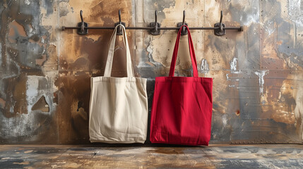 Stylish tote bags hanging on hooks, minimalist design. Colorful canvas shoppers represent sustainability, choice,  ecoconsciousness. Great for lifestyle, retail or product mockup.
