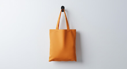 Minimalist orange fabric tote bag mockup, blank and hanging centered on a clean white wall for branding