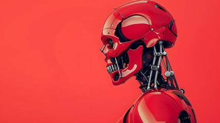 Red robot skull with shiny surface and visible mechanical parts on a red background.