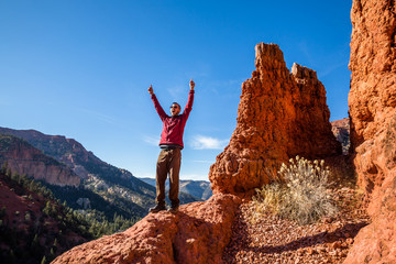 Excited man celebrating hiking in the red rock formations of Southern Utah.