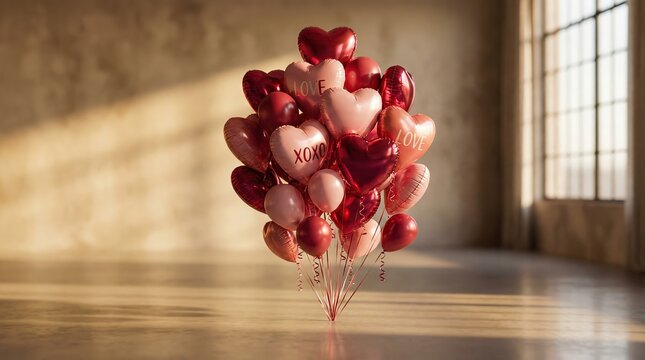 Valentine's day celebration indoor venue heart-shaped balloon arrangement bright natural light romantic ambiance