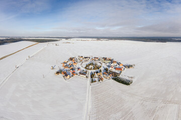 Aerial winter view of Gronowice, known as the Red Village, Poland. Snow-covered red rooftops and rural landscape captured by drone.