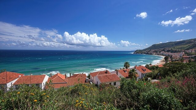 Coastal town with red rooftops and lush greenery overlooking the ocean under partly cloudy sky.