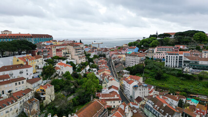 Aerial view of the old town's red rooftops and lush greenery in Lisbon, Portugal
