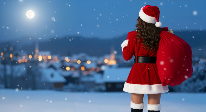 Woman in santa outfit carrying red sack looking at snowy village, Christmas delivery, banner with copy space.
