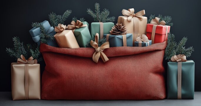 A large red sack filled with Christmas presents ,Cristmas, photo style