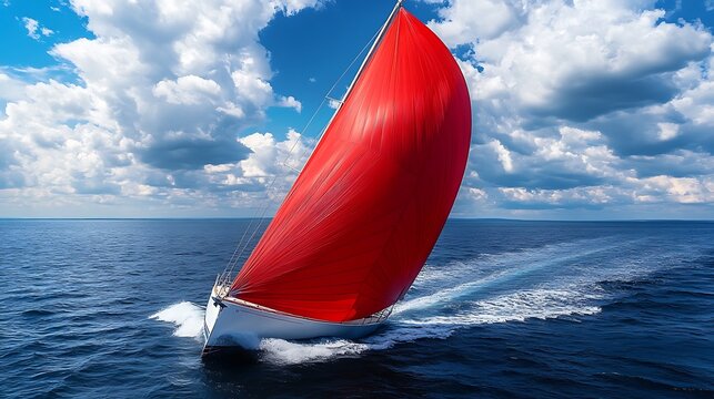 A red sail boat sails gracefully on the ocean waters during the serene sunset, casting a beautiful reflection on the calm waves