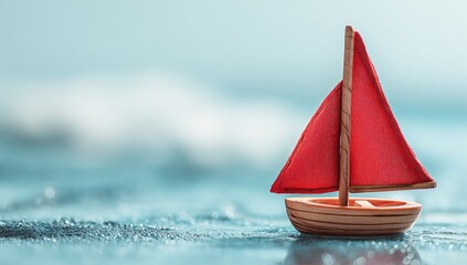 Miniature wooden sailboat with red sail on light blue water