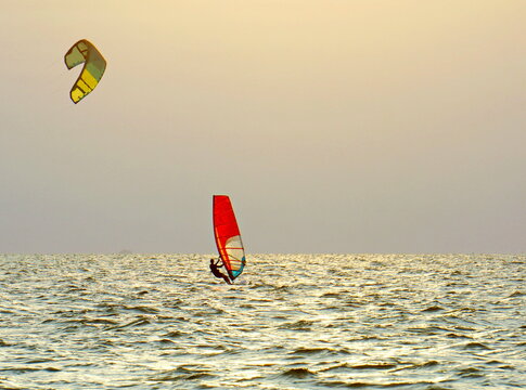 Windsurfing at sea. Red sail against the blue sky.
