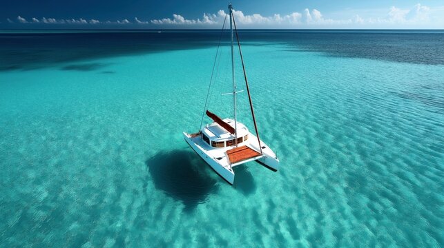 Sailboat sailing turquoise cove leaving wake near sandy beach and rugged limestone cliffs