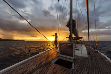 Sailboat gliding through sunrise clouds, captures tranquility and adventure