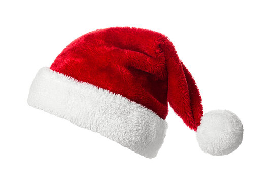 Red santa hat with white fluffy brim and pompom, isolated on transparent background