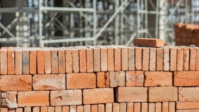 Modern house under construction with red clay bricks and scaffolding against blue sky, real estate development and building industry concept.