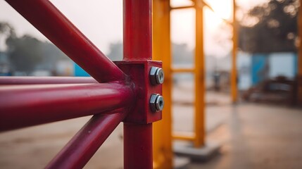 Close up of red metal scaffolding joints and bolts against a warm sunrise light at a construction site