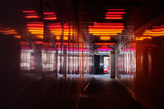 Hovering metallic orb reflecting neon magenta and cyan lights in industrial fog