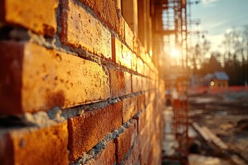 Close-up of red clay bricks with rough surfaces, set on ground at construction site with scaffolding blurred behind