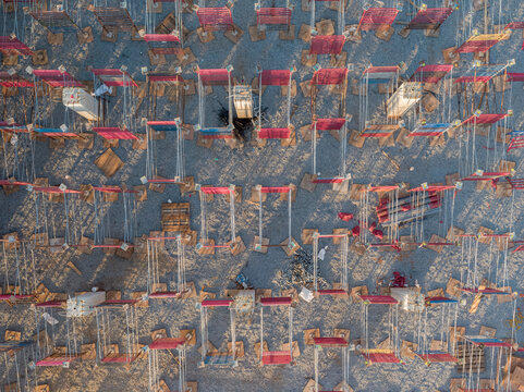 Detail shot of freshly laid red bricks and mortar on a construction site, with scaffolding and wooden elements visible.