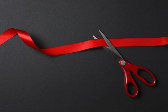 Grand opening invitation card template. Red scissors cutting red silk ribbon on black background, top view, copy space.