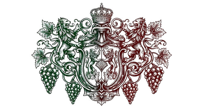 Elegant Heraldic Crest with Roaring Lions, Crown, and Grape Vines in Vintage Engraved Style