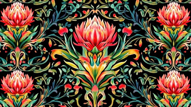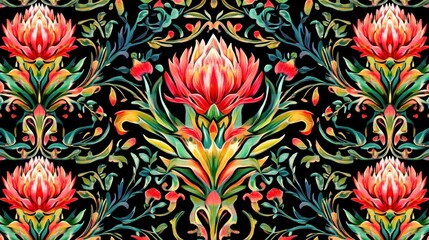 Ornate floral pattern on black background, featuring stylized blooms and scrolling foliage