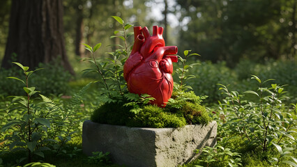 A red sculpture of a heart on a mossy pedestal in a forest